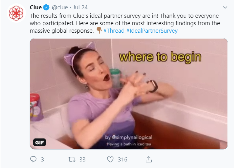 Clue, a menstrual health app with over 11 million users in 180 counties is one of the leaders in the FemTech space. Clue has over 18,000 twitter followers and tweets and retweets all day. Clue not only retweets about women’s health related research and menstruation but they create quality and insightful content on their blog (they have over 2 million monthly website readers!) They create video content that can be viewed on their YouTube channel and blog. More than 64,000 women across the world took the global survey this tweet below discusses! One of Clue's goals is to promote research in women's health and even this simple survey demonstrates how much interest and initiative women have in contributing and promoting research on women's wants and needs.